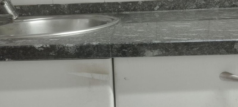 Azores Encimera 1Granito con tonos blanquecinos y amarillos que puede parecen dificil de combinar pero el resultado es increible