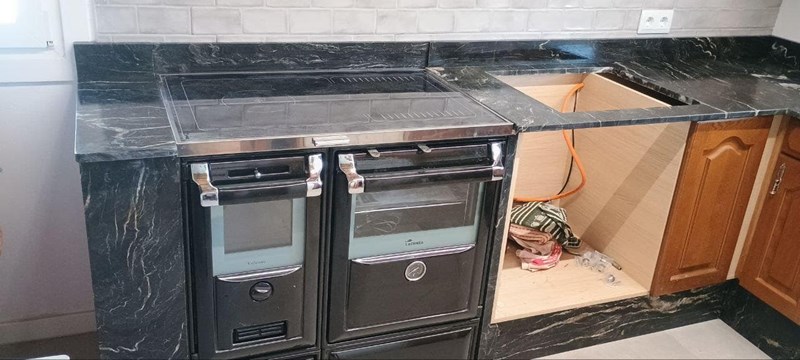 Encimera Sivlestre con cocina de hierroEnimera en escalón con frentes bajos de encimera alrededor de la cocina de hierro