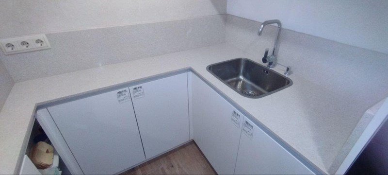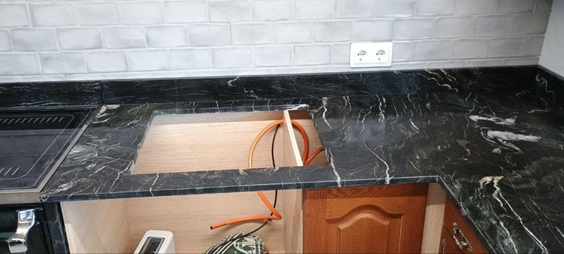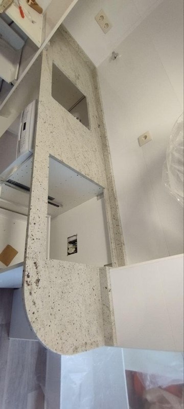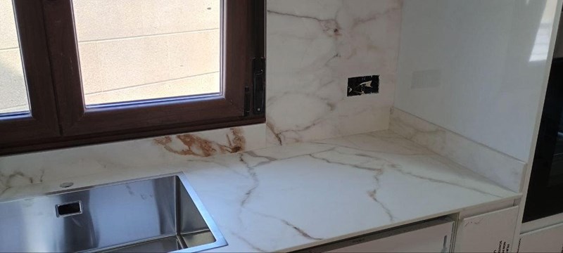 Bajo encimera en Bianco Statatuario Venato LucidatoEncimera de material porcelánico donde se ha realizado un bajo encimera