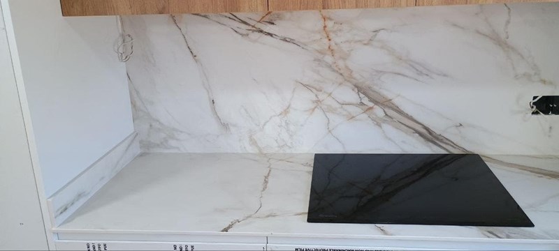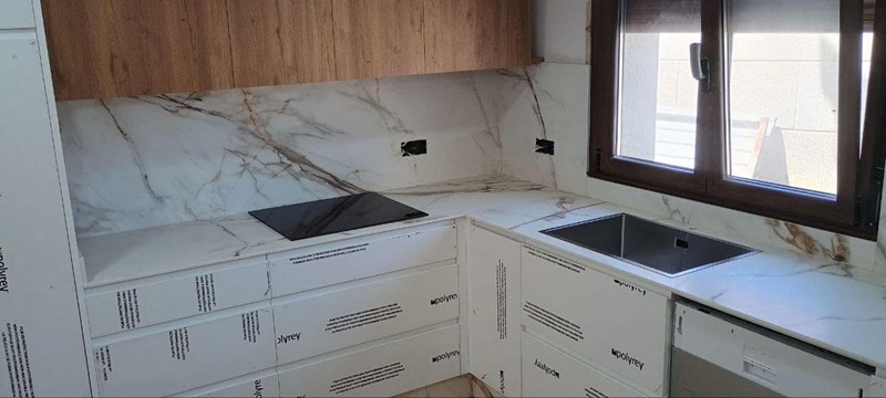 Encimera y chapeado en Coverlam Calacatta Gold